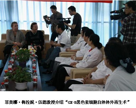 2012年4月29日下午,“中澳白癜风GX-B黑色素细胞自体体外再生术推广会”在广州新世纪白癜风防治研究院盛大举行,正在广州出席“烧伤康复与创面修复国际学术研讨会”的澳大利亚菲奥娜·梅拉妮·伍德(Fiona Melanie Wood)教授北京协和医院刘志飞教授、意大利组织与胚胎中心UbaldoArmato教授一行齐聚广州新世纪,共同探讨GX-B黑色素细胞自体体外再生术治疗白癜风的新近进展。