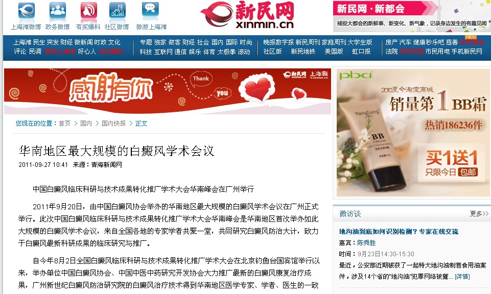 2011年9月20日,由中国白癜风协会举办的华南地区最大规模的白癜风学术会议在广州正式举行。此次中国白癜风临床科研与技术成果转化推广学术大会华南峰会是华南地区首次举办如此大规模的白癜风学术会议,来自全国各地的专家学者共聚一堂,共同研究白癜风防治大计,致力于白癜风最新科研成果的临床研究与推广。