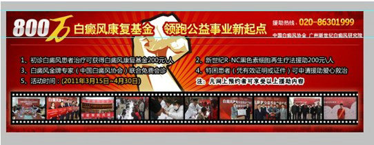 活动简介:“GX-B多维白癜风康复工程康复奇迹”健康科普暨关爱白癜风患者800万公益援助活动是由全国关心下一代工作委员会教育发展中心、中国健康事业对外交流协会、健康时报社主办,由新世纪医疗门诊部-广州新世纪白癜风防治研究院(技术协作单位)承办的一项旨在为白癜风患者提供系统的医疗服务的公益援助活动。该活动按照"人道、博爱、奉献"的方针,对广大白癜风患者尤其是贫困地区的青少年患者提供系统的减免治疗、康复指导、心理疏导、科普宣传等多种形式的医疗援助工作,为建设和谐社会尽一份心力。 此次活动由新世纪医疗门诊部-广州新世纪白癜风防治研究院(技术协作单位)拨款761.6万元,陆续对广州、广西、甘肃、青海、宁夏、西藏、新疆、山西、河南、黑龙江、吉林、辽宁、河北、内蒙、山东、云南、贵州、四川、湖北、湖南、江西等地的30多个贫困地区的白癜风患者给予医疗援助。