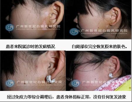 病症:患者白斑分布在脸部靠近耳朵周围,患者发现了白斑就去了医院就诊。采用过一些传统的治疗方法没有治愈,来到我院治疗。
