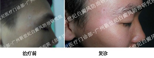 治疗用药一个月左右,白斑边界清楚,经检查病情已基本稳定,白斑病灶明显色素生白斑面积逐渐缩小,几乎消失。