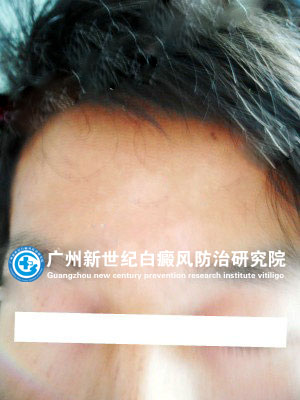 病症:患者额头,左侧脸颊部位有白癜风症状。 发病之初就前来我研究院进行康复治疗,没有自行用药史,经检查患者没有过敏史。 专家建议:进行体内微量元素、伍德灯病灶检查。
