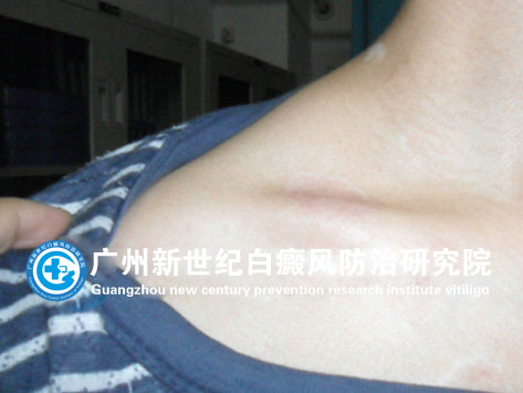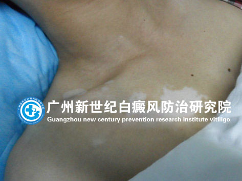概述:患者无家族史,前胸附近有块状白癜风症状,后经权威检查,其患处色素脱失,白癜风有扩散迹象,正处于发展期,有一些普通中西医药物治疗史。
