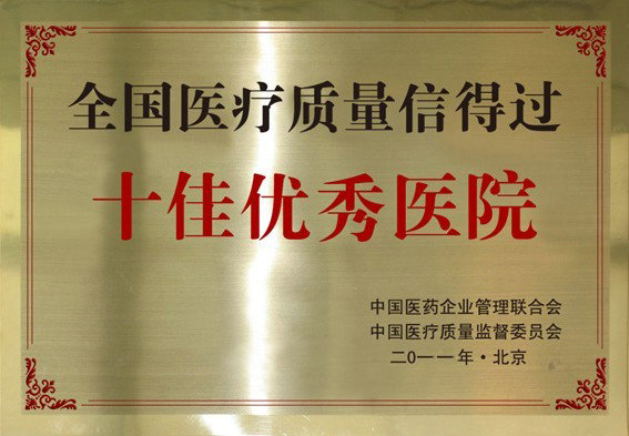 2011年10月,中国医疗质量监督委员会、中国医院企业管理联合会共同授予我院“全国医疗质量信得过十佳优秀医院”称号,以表彰我院在狠抓医疗质量管理工作中取得的突出成绩。本次评审十分严格,我院是在参审的全国数千家医疗机构中脱颖而出,得到评审单位的高度评价。