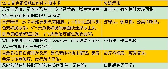 此技术经过我院对白癜风康复工程的延伸与发展,与我院原有的九大治疗技术相结合,发展为黑色素细胞自体体外再生术,有着自身的优势: